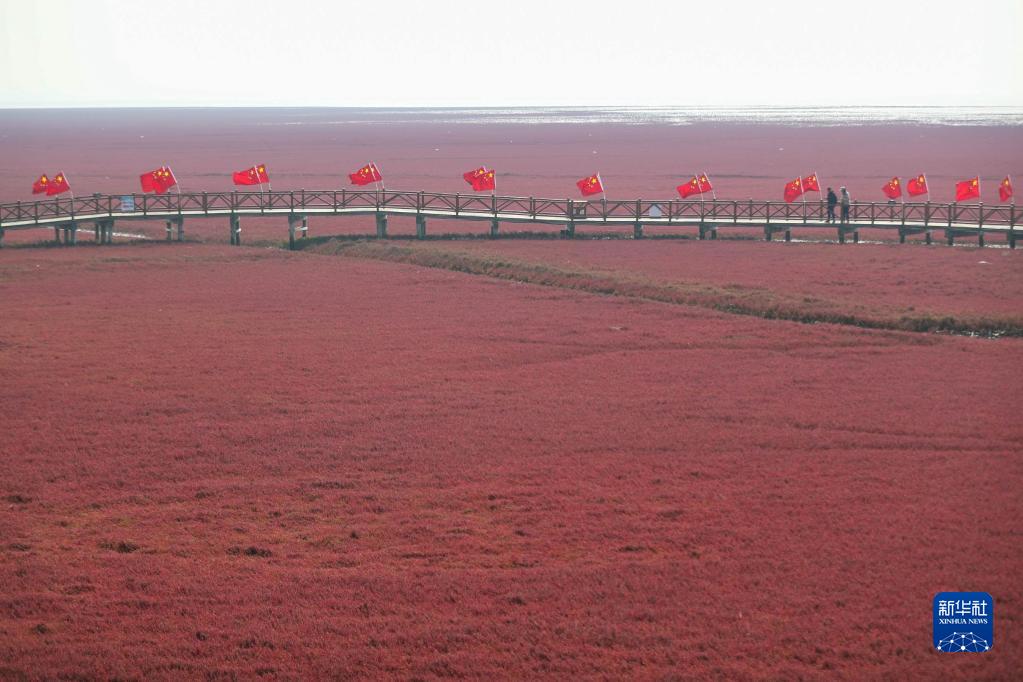 這是盤錦市紅海灘國家風景廊道景區內的紅海灘風光(2022年9月28日攝,無人機照片)。