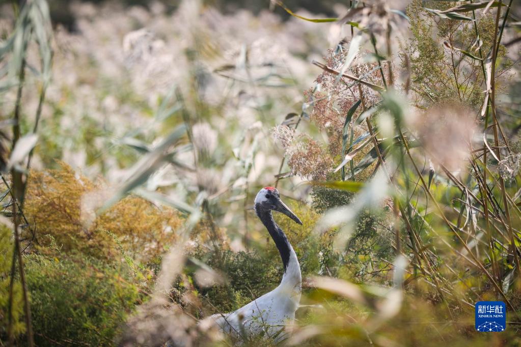 一只丹頂鶴在遼河口國(guó)家級(jí)自然保護(hù)區(qū)覓食(2022年9月28日攝)。