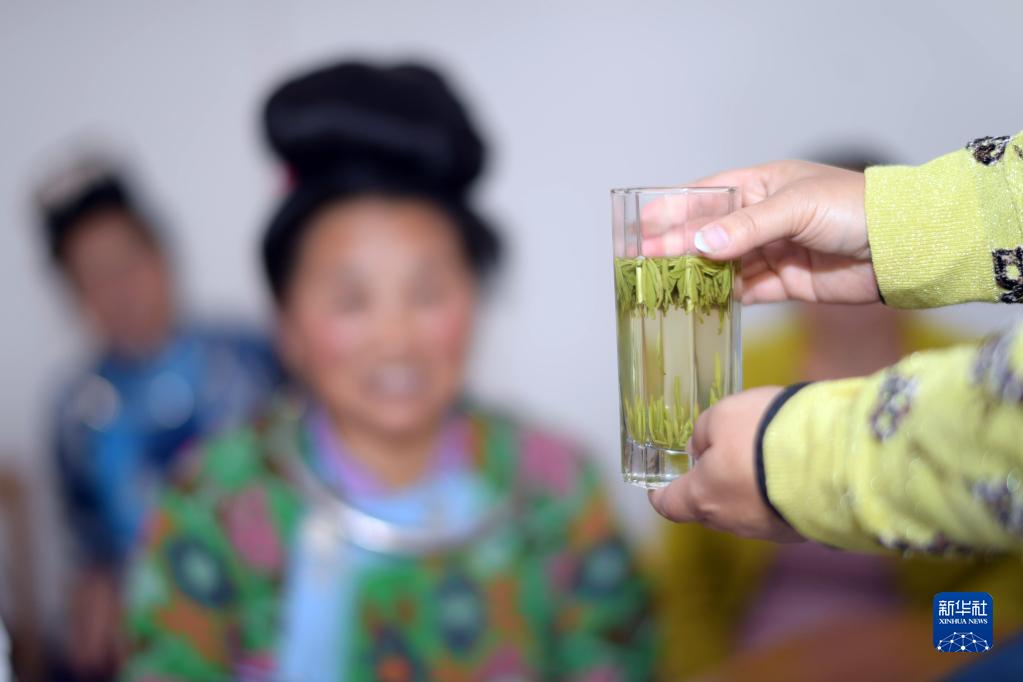 10月26日,在丹寨縣興仁鎮(zhèn)擺泥村,當(dāng)?shù)胤N茶能手向村民展示茶葉的沖泡效果。