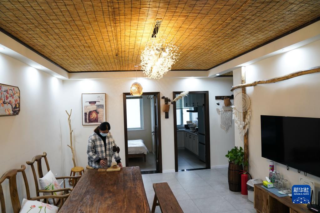 服務員在江蘇省泗洪縣臨淮鎮勝利社區一家民宿內整理房間(10月26日攝)。