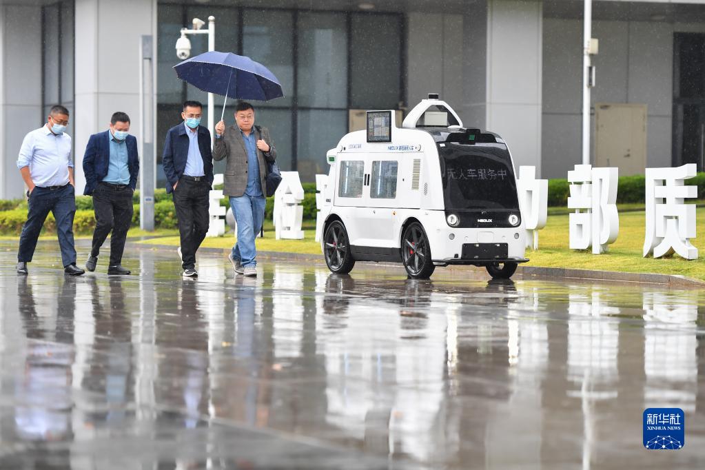 10月27日,在湖南湘江新區的湖南省檢驗檢測特色產業園內,無人駕駛零售車從行人旁邊經過。
