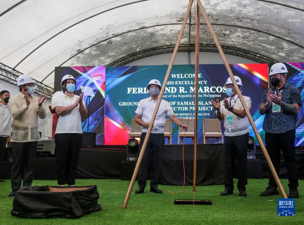 10月27日,菲律賓總統馬科斯(中)與菲律賓副總統莎拉·杜特爾特(左二)、中國駐菲律賓大使黃溪連(左一)、菲律賓公共工程和公路部長曼努埃爾·博諾安(右二)、達沃市長塞巴斯蒂安·杜特爾特(右一)等在達沃-薩馬爾島大橋的開工儀式上埋設時間膠囊。