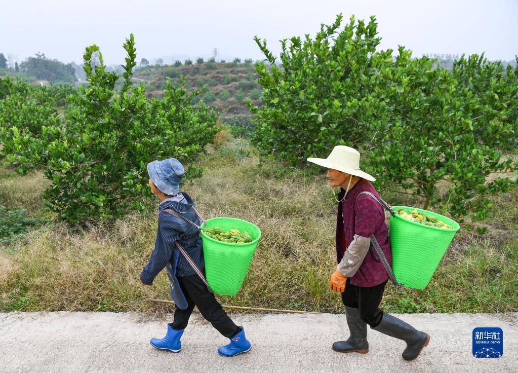 10月27日,在重慶大足區(qū)金山鎮(zhèn)天河村,村民背運(yùn)剛采摘的佛手。