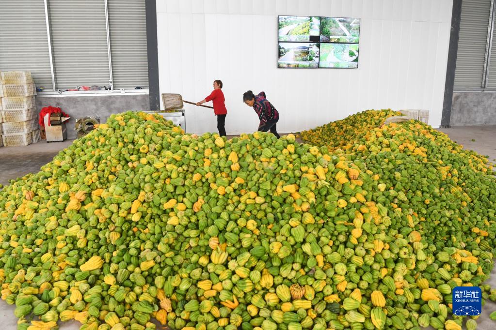 10月27日,在重慶大足區金山鎮天河村,村民整理佛手。