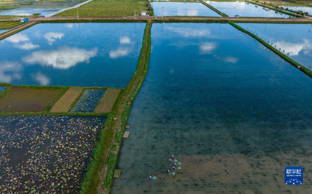 農(nóng)戶在云南省大理白族自治州洱源縣右所鎮(zhèn)松曲村海菜田內(nèi)忙碌(10月27日攝,無人機照片)。