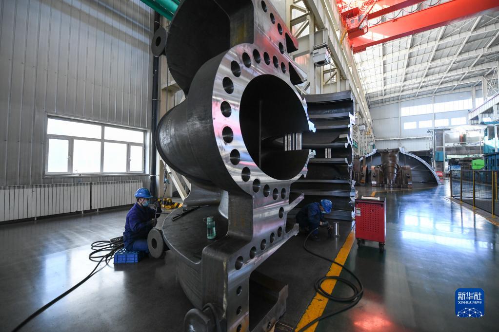 哈電集團(tuán)哈爾濱汽輪機(jī)廠有限責(zé)任公司工人在生產(chǎn)車間作業(yè)(10月27日攝)。