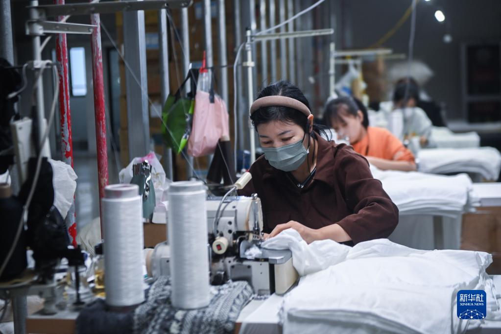 10月27日,在浙江省諸暨市大唐街道的一家專業生產拉絨打底褲產品的企業車間內,工作人員在加工拉絨打底褲。