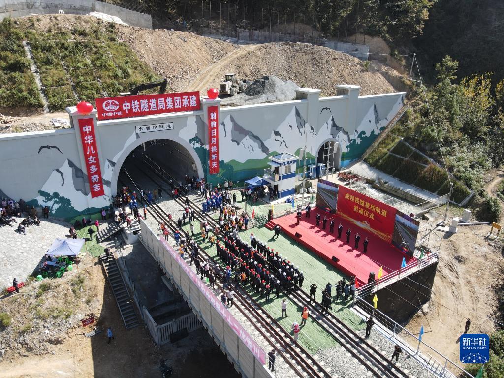 這是10月28日在四川省涼山彝族自治州喜德縣小相嶺隧道口拍攝的成昆鐵路復線軌道貫通儀式(無人機照片)。