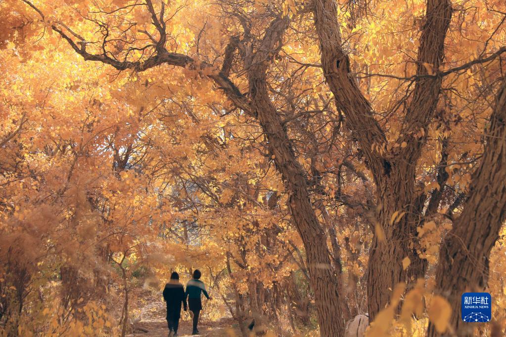 10月25日,游客在甘肅省敦煌市莫高鎮的胡楊林中游玩。