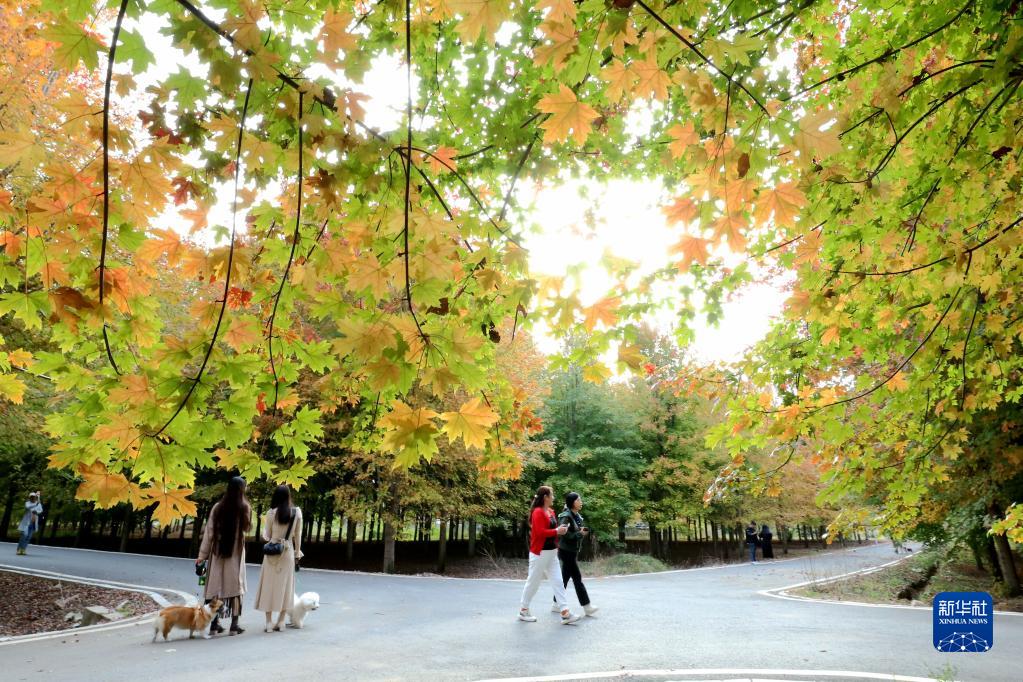 10月21日,游客在山東省青島市西海岸新區張家樓街道張家樓村楓樹林賞景游玩。