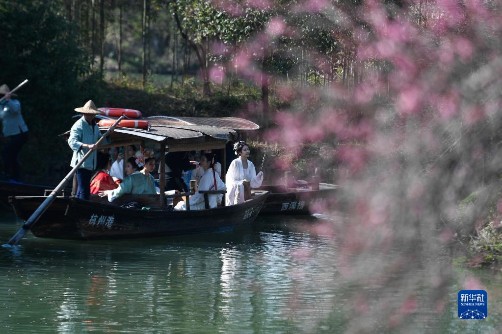 漢服愛好者在杭州西溪國家濕地公園乘坐搖櫓船賞梅(2021年2月21日攝)。