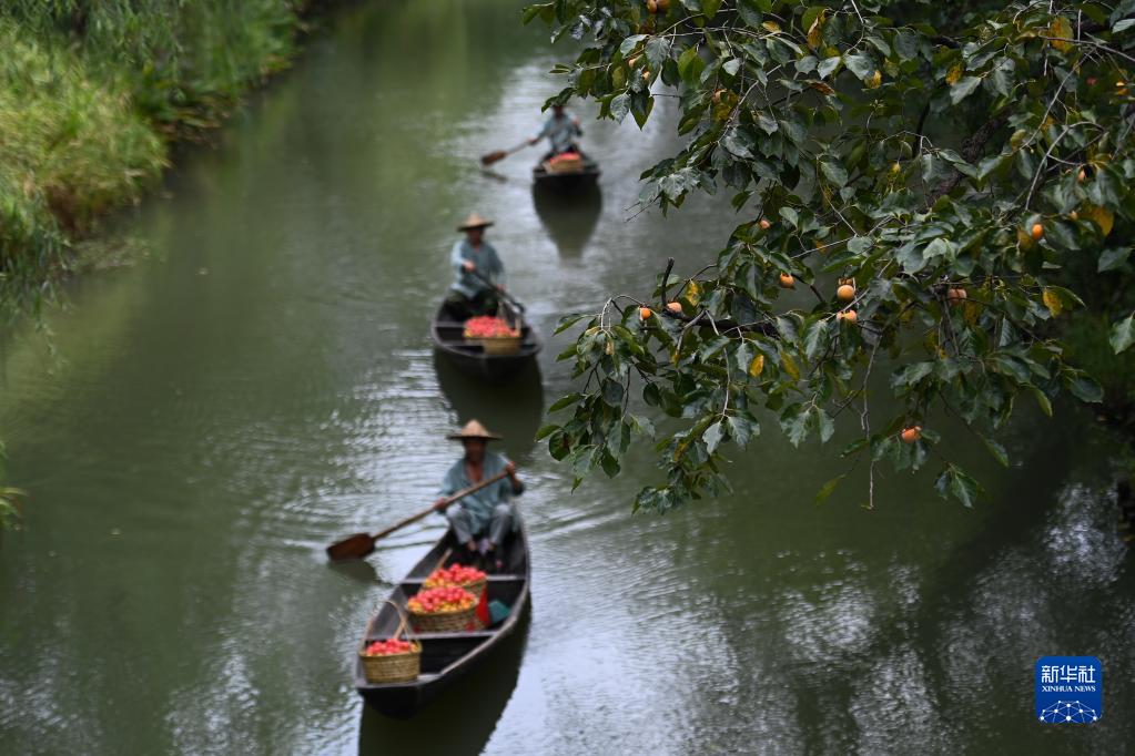 西溪濕地的工作人員用船運(yùn)送剛采摘的柿子(2022年9月23日攝,無(wú)人機(jī)照片)。