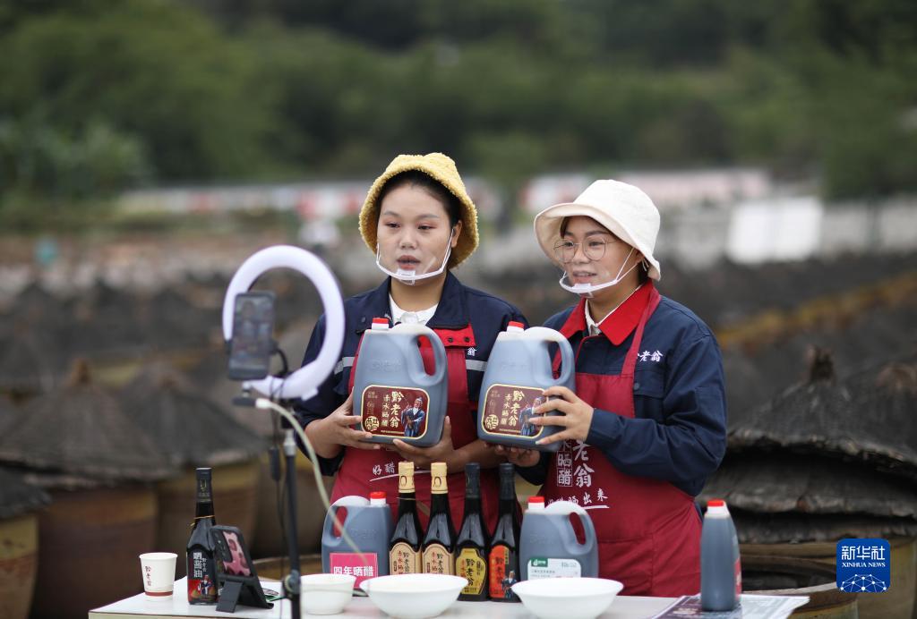 10月28日,在貴州省赤水市黔老翁醋廠,主播通過網絡直播方式銷售曬醋。