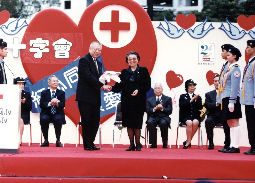 1997年,時任中國紅十字會會長錢正英同志向香港紅十字會贊助人、時任香港特首董建華授旗。