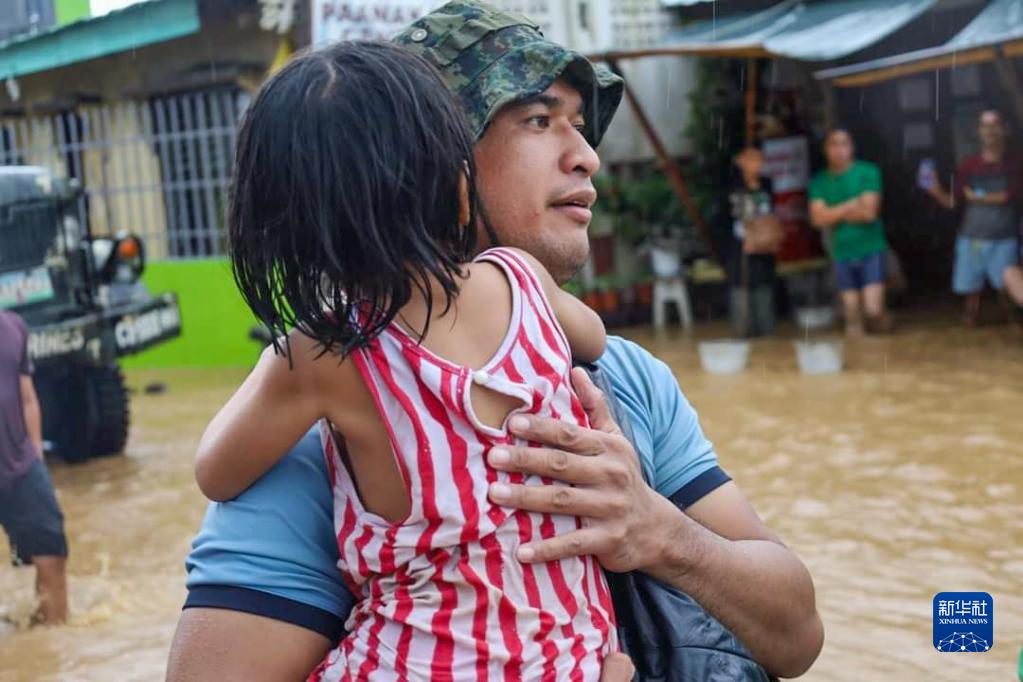 10月28日,在菲律賓馬京達瑙省帕朗,救援人員抱著一名兒童從洪災區轉移。