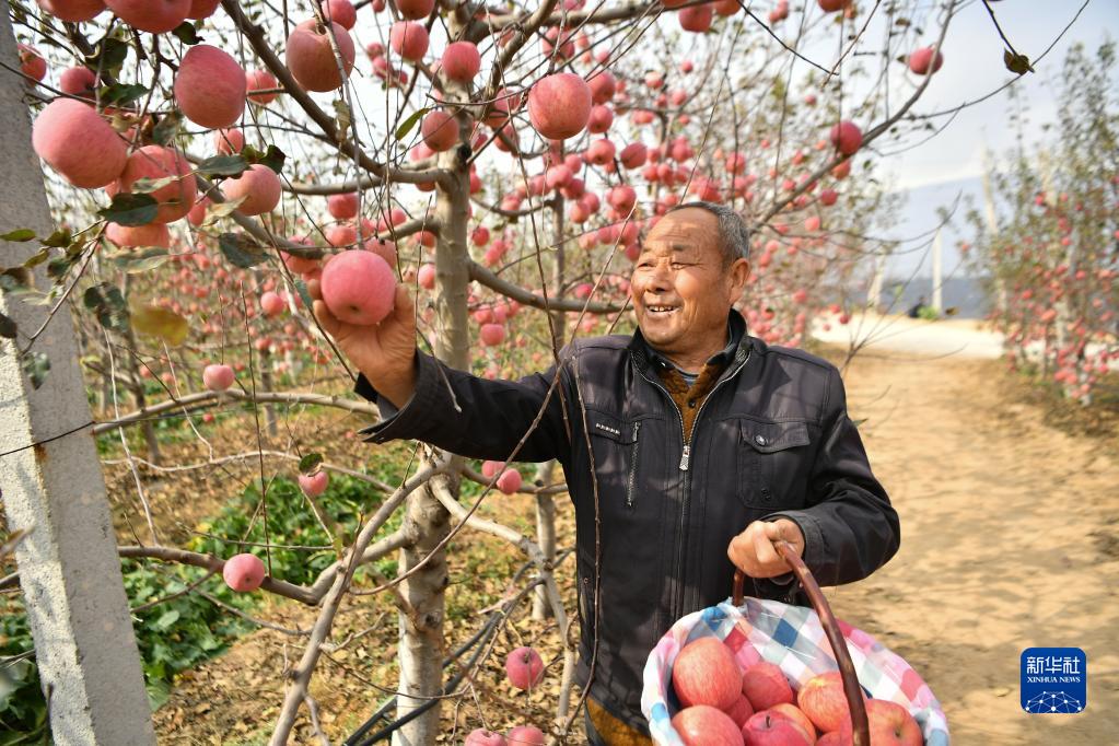 10月27日,在陜西省延安市安塞區南溝村,果農在果園采摘蘋果。 新華社記者 張博文 攝