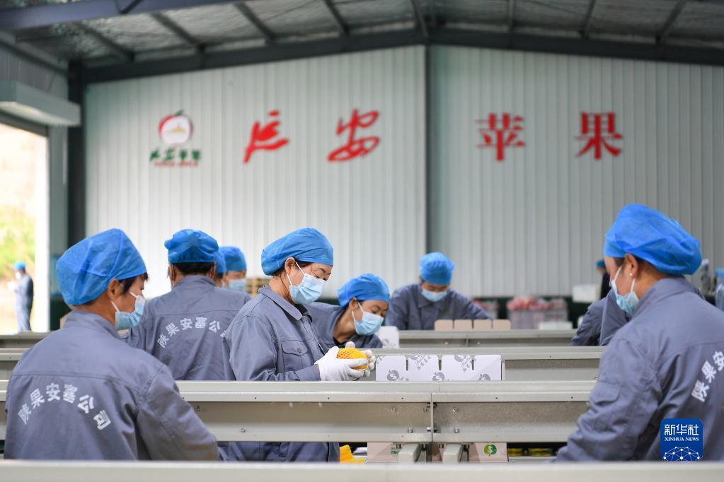 10月27日,在陜西省延安市安塞區(qū)南溝村,工作人員在蘋果洗選車間裝箱打包蘋果。 新華社記者 張博文 攝