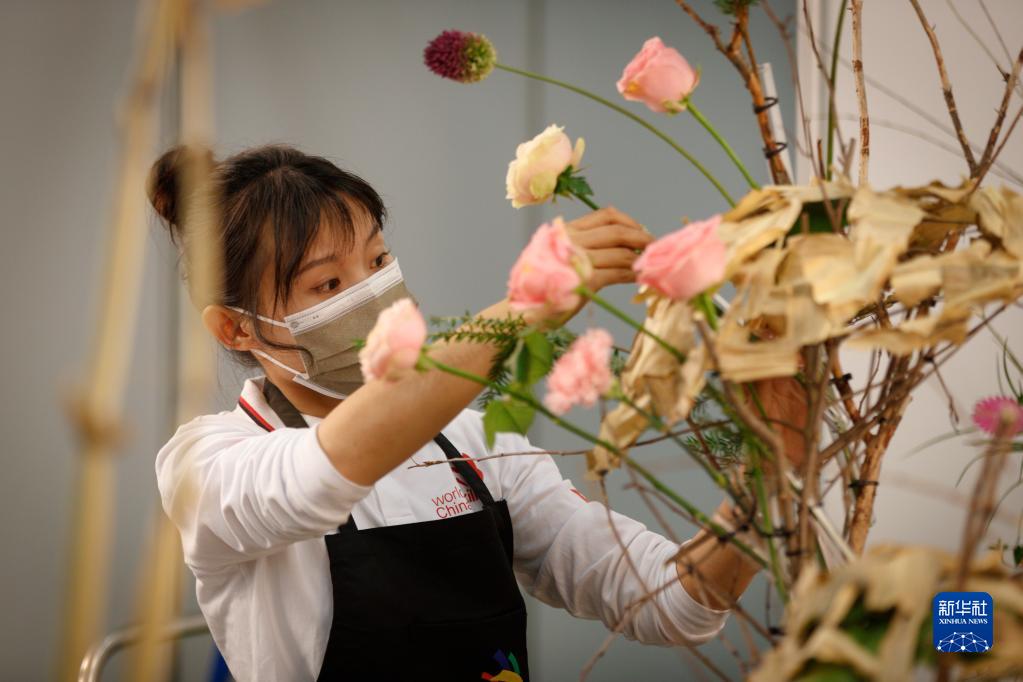 10月23日,獲花藝項目優勝獎的上海農林職業技術學院楊靈芝在芬蘭首都赫爾辛基參加2022年世界技能大賽特別賽芬蘭賽區比賽。