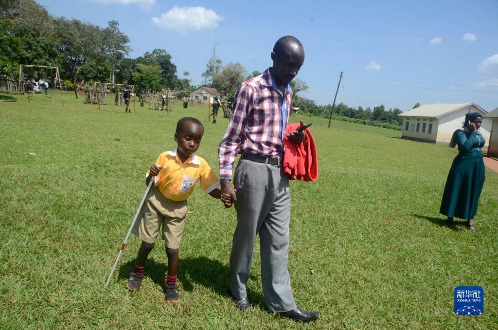 10月25日,在烏干達(dá)中部穆科諾地區(qū)一所盲人學(xué)校,火災(zāi)后一名男子領(lǐng)著一名視障兒童行走。