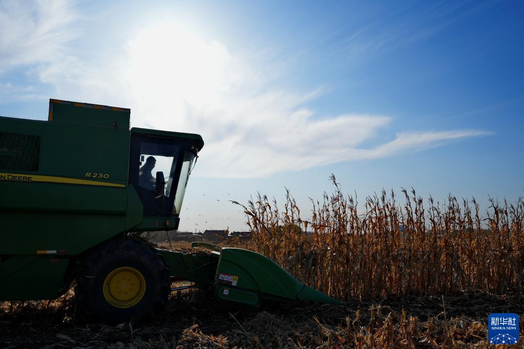 10月28日,在吉林省四平市梨樹縣國家百萬畝綠色食品原料(玉米)標準化生產基地核心示范區,農民駕駛農機進行秋收作業。