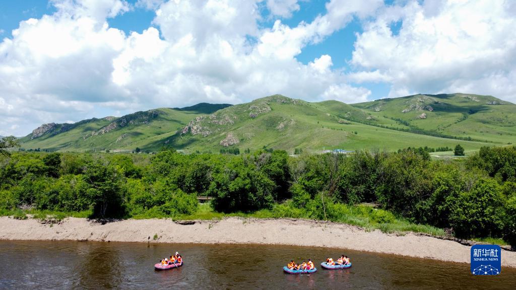6月27日,游客在額爾古納濕地體驗漂流(無人機照片)。