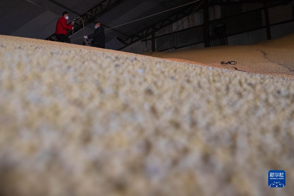 10月25日,在綏化市益盛糧食購銷有限公司內,工人進行扦樣作業,以此了解儲存倉內大豆水分、雜質以及蟲害等情況。