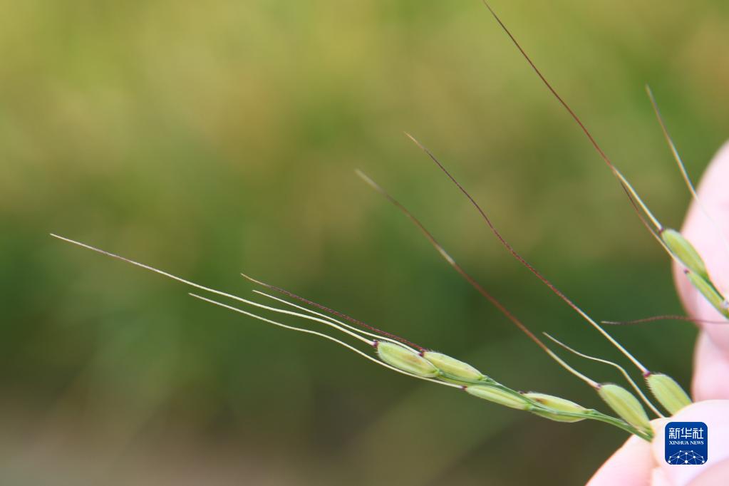 10月27日,在中科院合肥研究院智能所離子束生物工程與綠色農(nóng)業(yè)研究中心的育種基地里,副研究員葉亞峰介紹野生稻的稻芒。