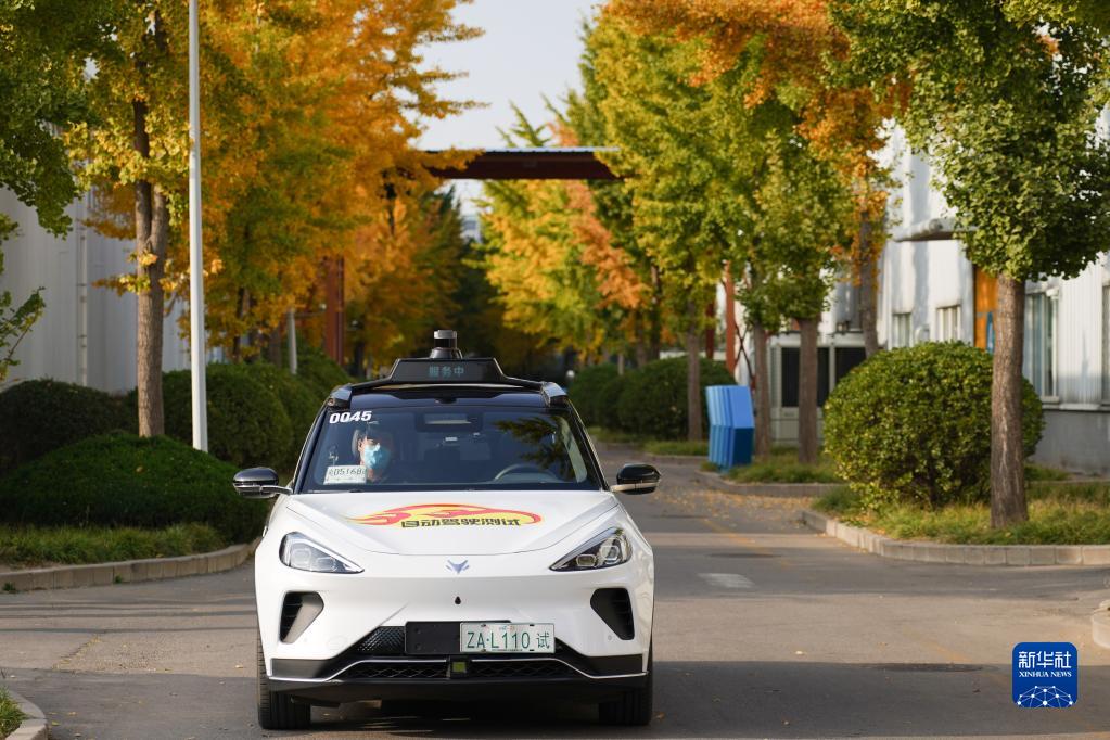 在北京經濟技術開發區,一輛“主駕無人、副駕駛配備安全員”的無人駕駛車在行駛中(11月1日攝)。