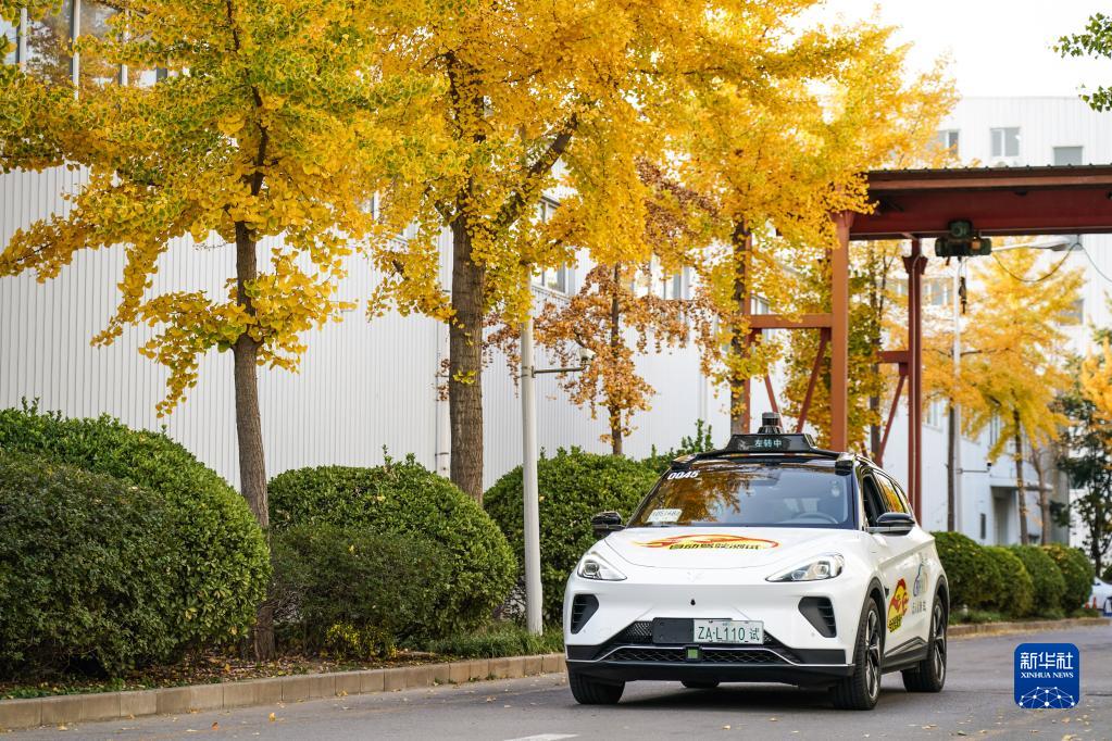 在北京經濟技術開發區,一輛“主駕無人、副駕駛配備安全員”的無人駕駛車在行駛中(11月1日攝)。