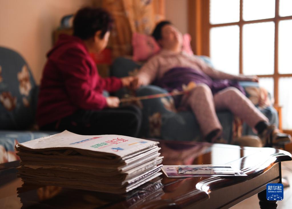 胡燕均幫助女兒進行蹬車訓練。客廳桌子上放有胡燕均十年來寫的二十多本日記(11月1日攝)。