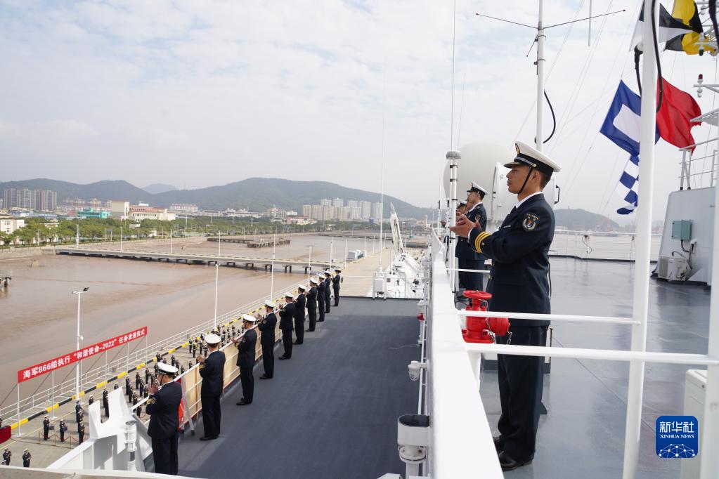 11月2日,執(zhí)行“和諧使命-2022”任務(wù)的中國(guó)海軍“和平方舟”號(hào)醫(yī)院船從浙江舟山某軍港解纜起航。這是歡送儀式現(xiàn)場(chǎng)。