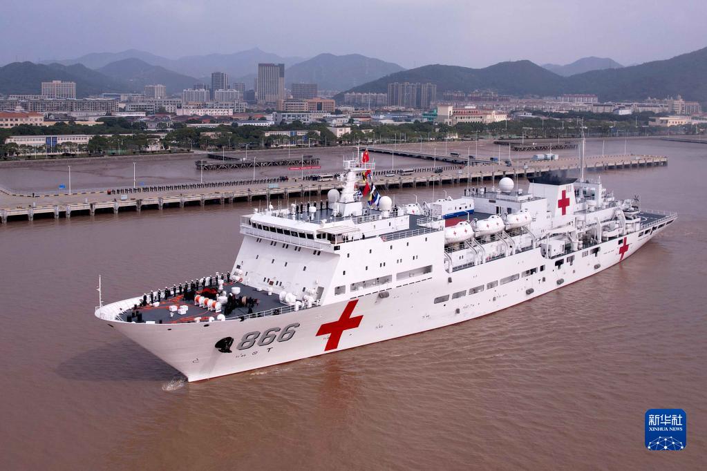 11月2日,執(zhí)行“和諧使命-2022”任務(wù)的中國(guó)海軍“和平方舟”號(hào)醫(yī)院船從浙江舟山某軍港解纜起航(無人機(jī)照片)。