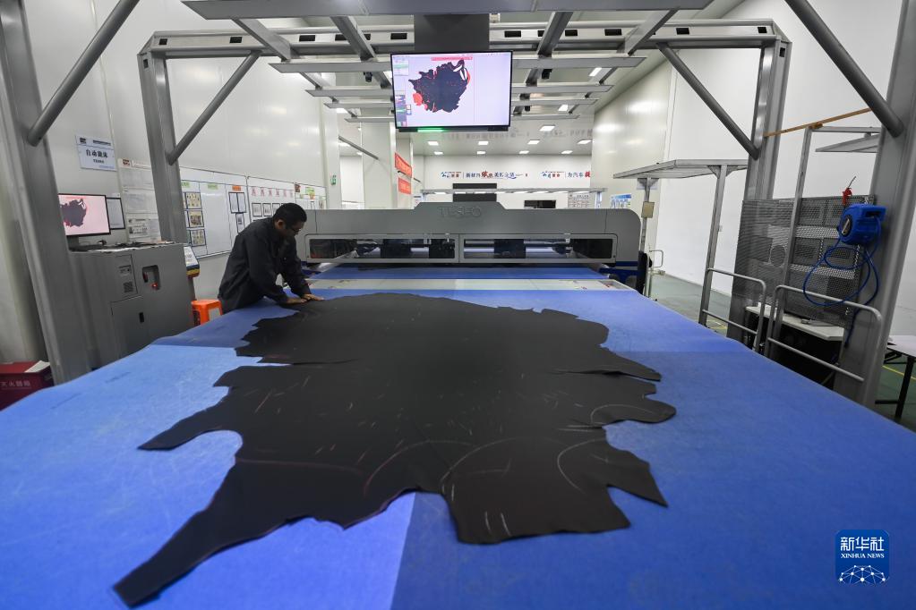 11月2日,在嘉興南湖區的明新旭騰新材料股份有限公司的牛皮汽車革數字化車間內,自動化裁床準備從一整塊皮料上裁剪出不同形狀的車用皮料。