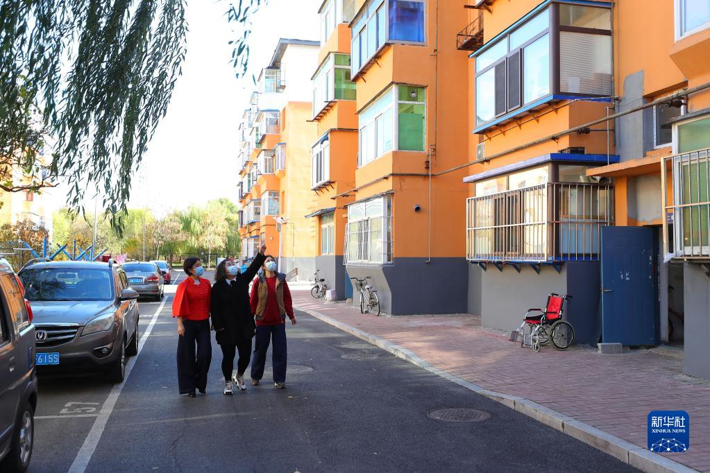 11月1日,在沈陽市蘇家屯區解放街道金山社區金山四小區,吳書香(左一)同社區干部查看老舊小區改造情況。