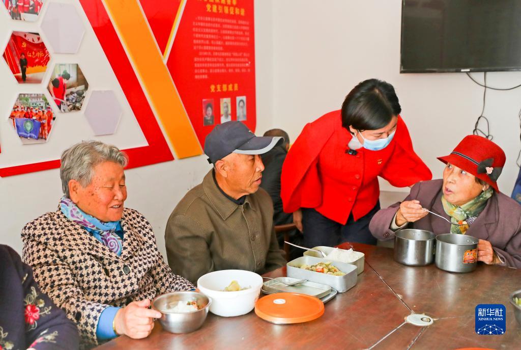 11月1日,在沈陽市蘇家屯區解放街道金山社區愛心公益食堂,吳書香和就餐老人交流。愛心公益食堂免費向社區及周邊70歲以上有需求的老人提供午餐。