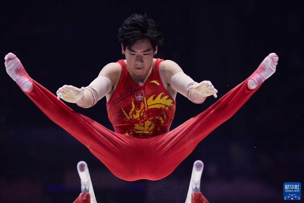 11月2日,中國(guó)隊(duì)選手張博恒在雙杠比賽中。