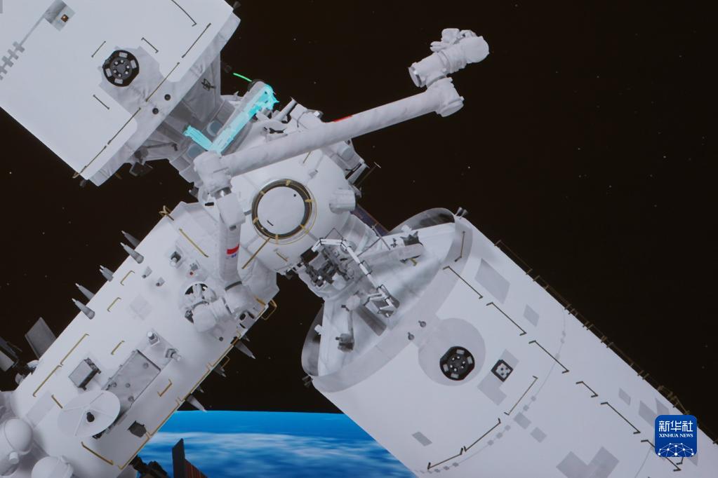 11月3日在北京航天飛行控制中心拍攝的空間站夢天實驗艙完成轉位的模擬圖像。