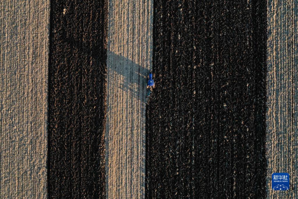 在吉林省公主嶺市環嶺街道土城子村,農民駕駛拖拉機對已收獲的耕地進行秸稈深翻還田保護性作業(無人機照片,11月1日攝)。