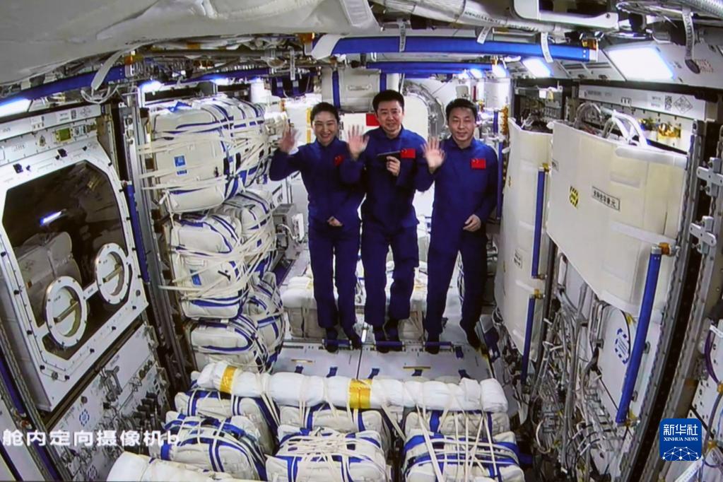 11月3日在北京航天飛行控制中心拍攝的神舟十四號(hào)航天員陳冬(中)、劉洋(左)、蔡旭哲進(jìn)入夢(mèng)天實(shí)驗(yàn)艙。