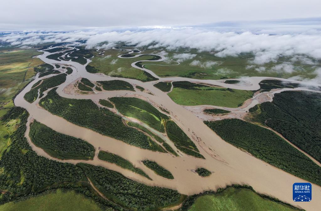 俯瞰黃河若爾蓋縣唐克鎮(zhèn)段一角(2022年8月15日攝,無人機(jī)照片)。