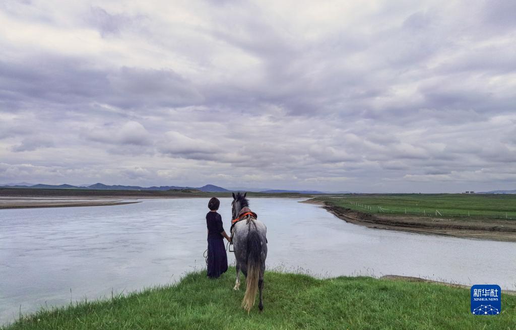 在若爾蓋縣麥溪鄉(xiāng)嘎沙村,一位牧民牽著馬眺望黃河(2022年7月26日攝)。她所在的位置是黑河入黃河口,也是黃河出川口。