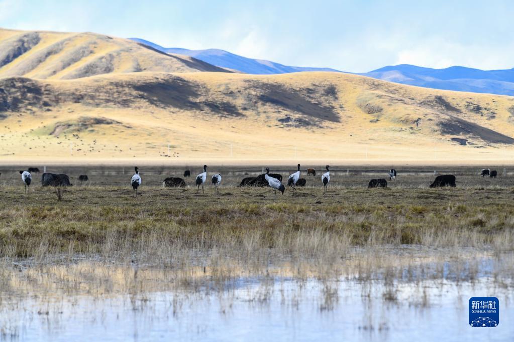 一群國家一級保護動物黑頸鶴在四川省阿壩藏族羌族自治州若爾蓋縣的濕地活動(2022年10月17日攝)。