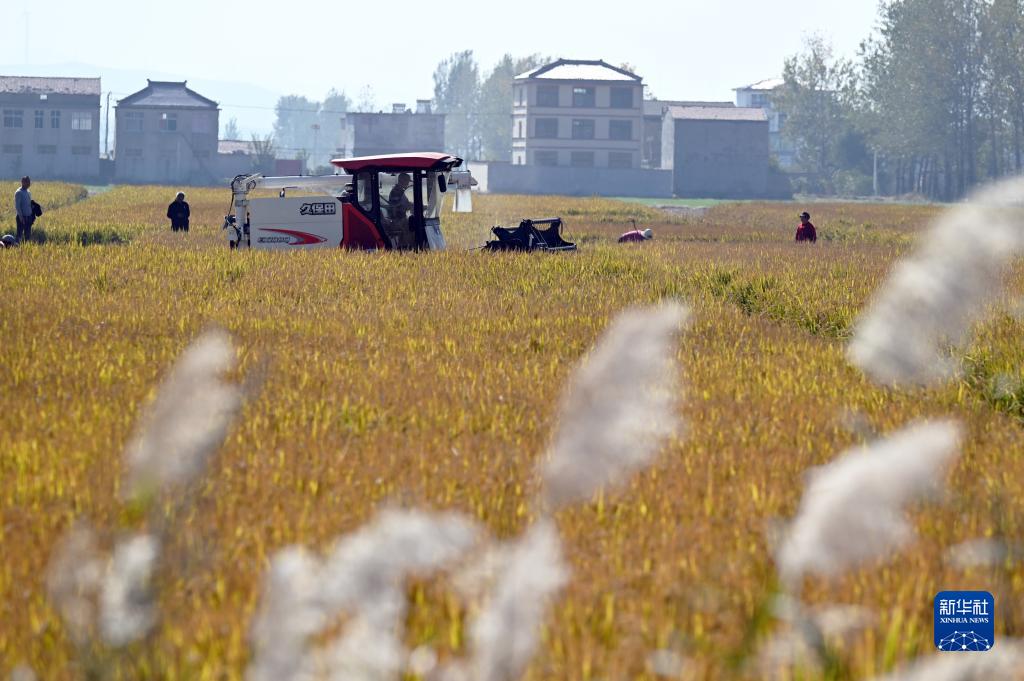 11月2日,在安徽省宿州市埇橋區夾溝鎮鎮頭村,村民駕駛收割機收割水稻。