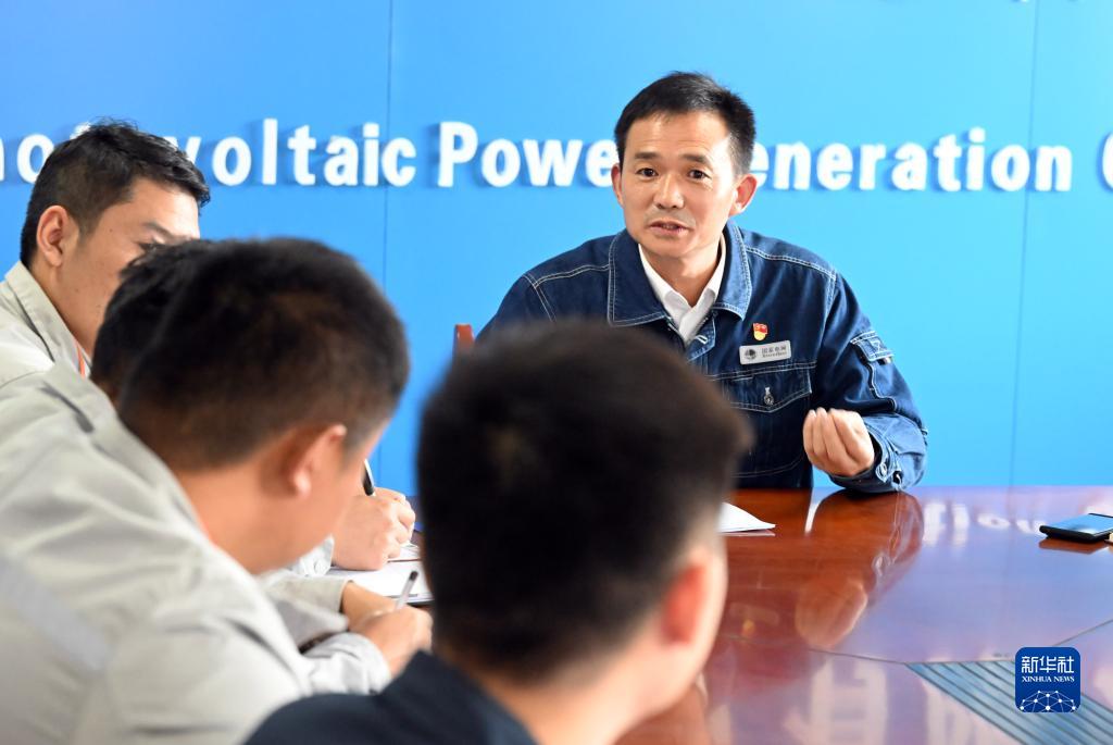 11月2日,廖志斌(右)在宿州市符陽光伏發電有限公司宣講黨的二十大精神。