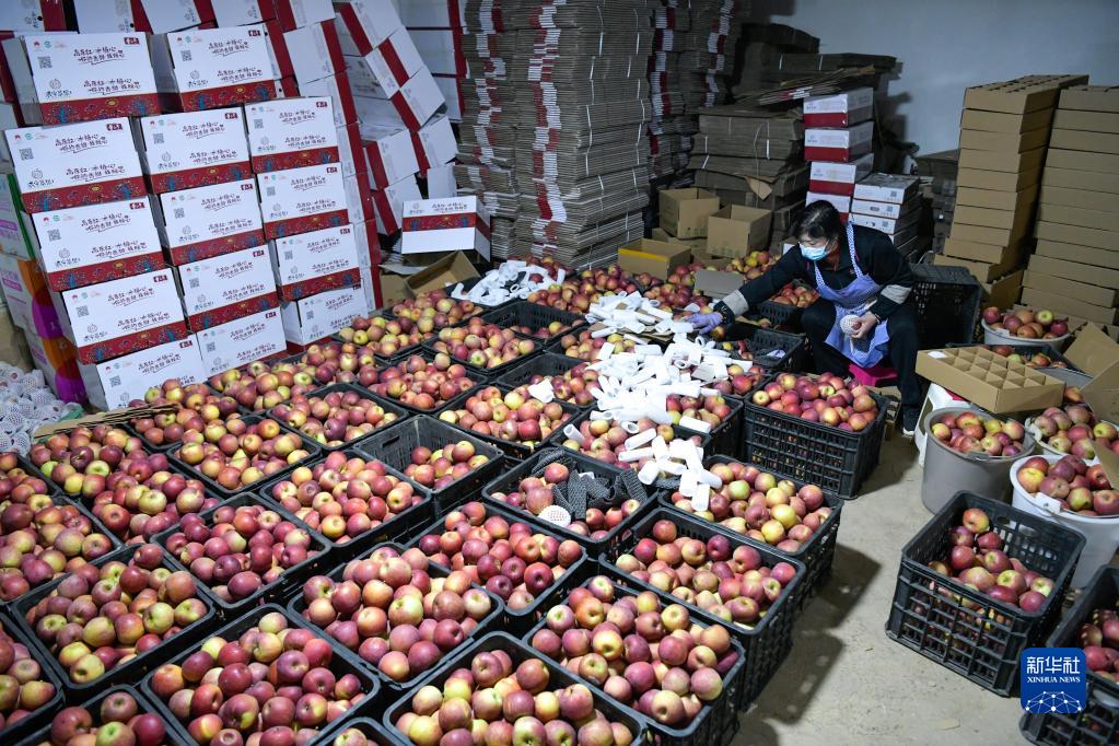 11月2日,果農(nóng)在貴州省威寧縣牛棚鎮(zhèn)一合作社里包裝蘋(píng)果。