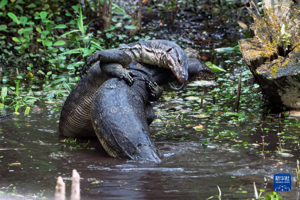 在新加坡雙溪布洛濕地保護區拍攝的兩只馬來亞水巨蜥(6月27日攝)。