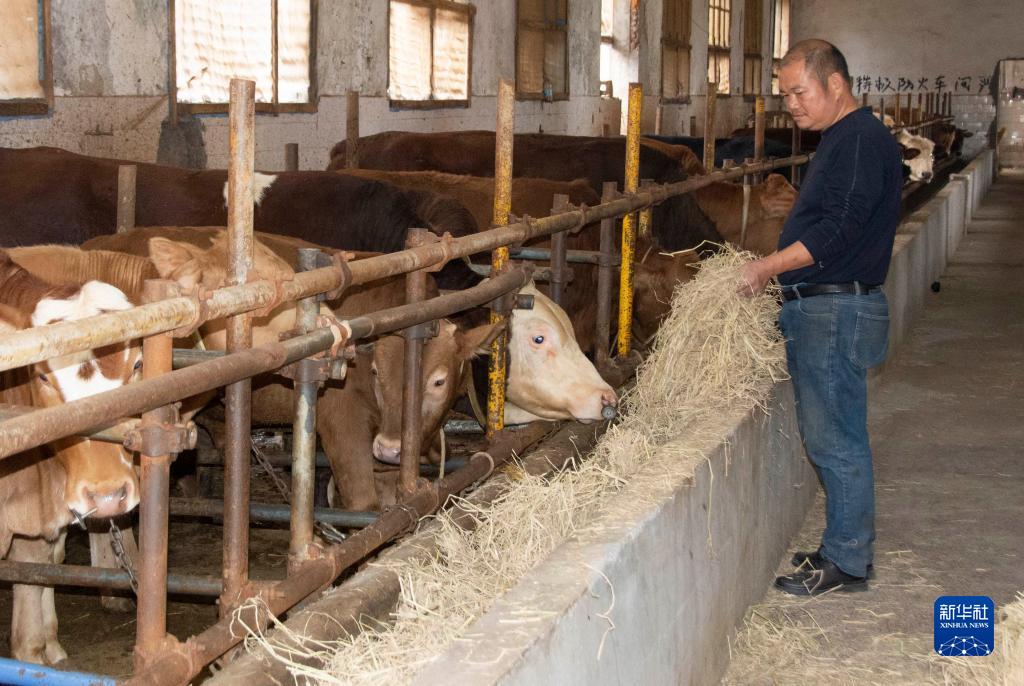 11月4日,湖南省湘潭市湘潭縣河口鎮華中村村民用回收的秸稈喂牛。