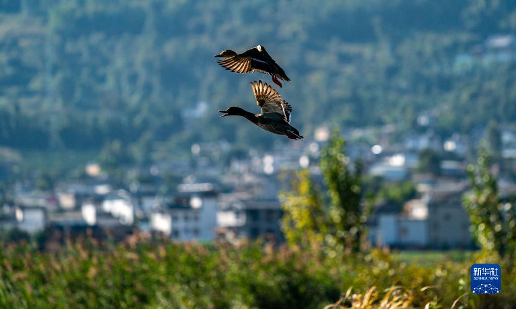 兩只野鴨在濕地上空飛行(10月28日攝)。