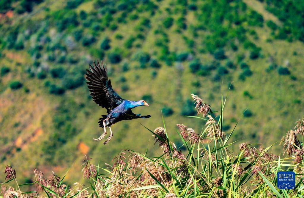 在濕地蘆葦間跳躍的紫水雞(10月28日攝)。