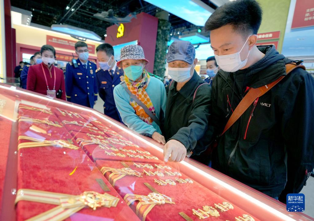 11月4日,來自北京西城區的李抗美(右二)、王昭慧(右三)老兩口與兒子(右一)一起觀看展出的獎章。為能盡快參觀“奮進新時代”主題成就展,老兩口讓兒子10月31日零點就上線登記預約。